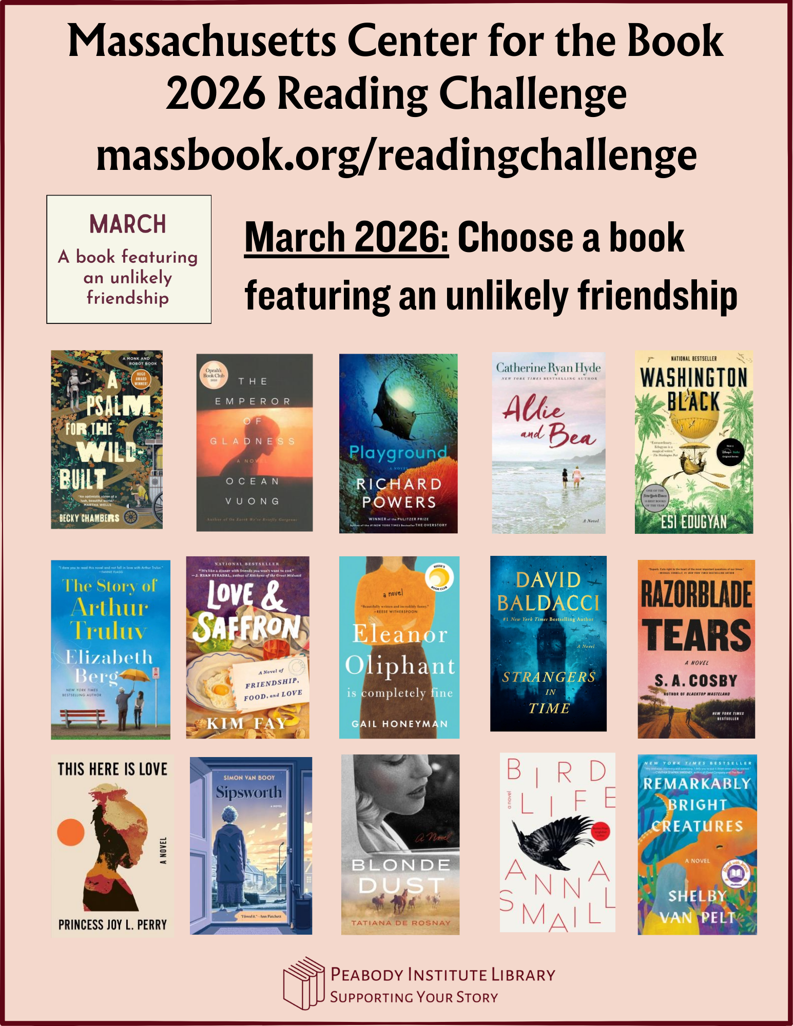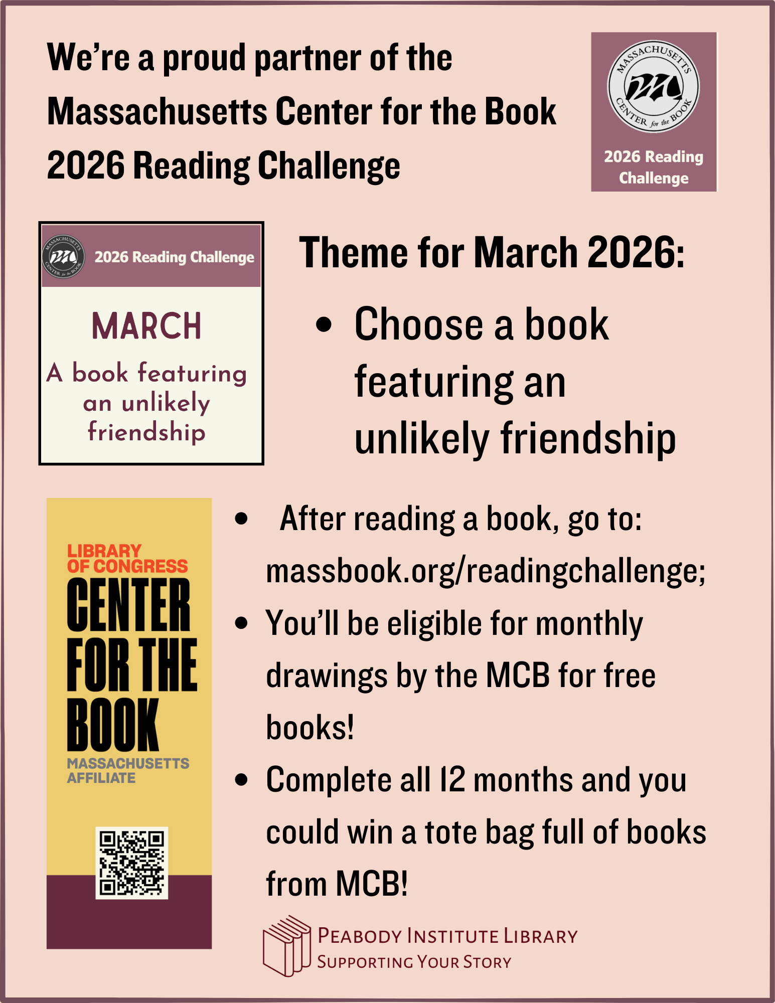 The Peabody Library is proud to partner with Massachusetts Center for the Book for the 2026 Reading Challenge.